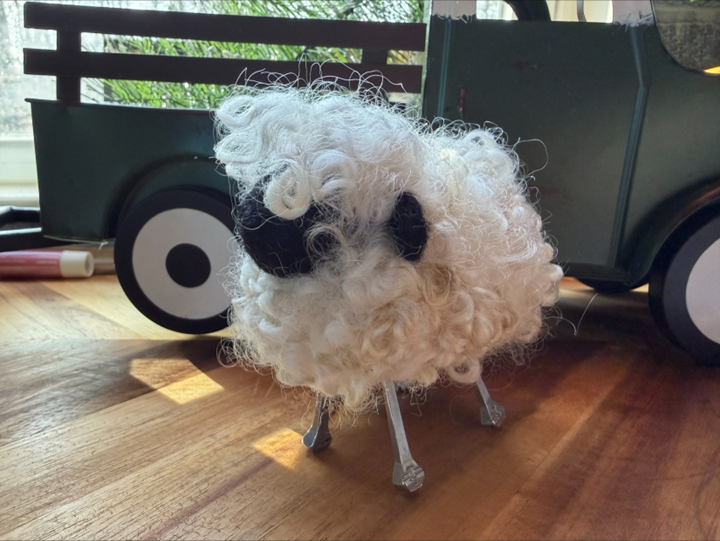 Make this adorable lamb using sheep fleece and real horseshoe nails as legs.